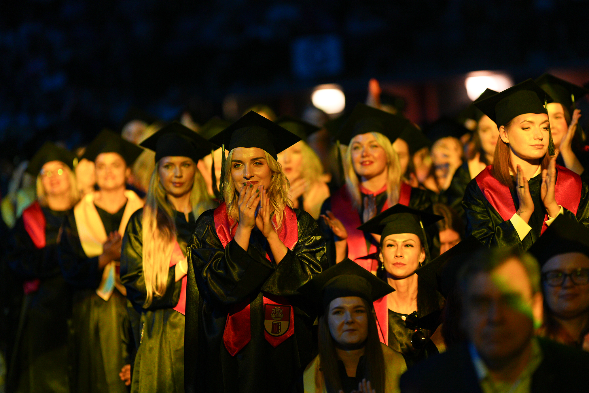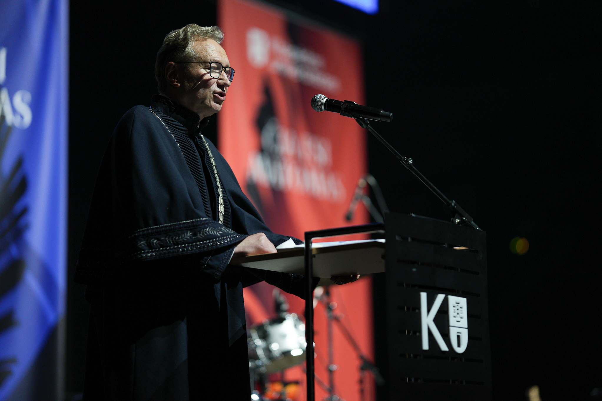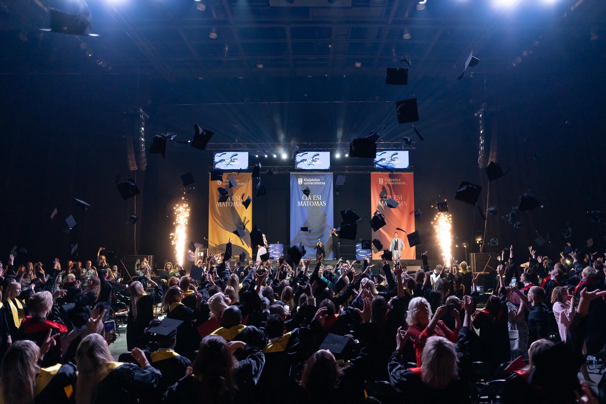 The celebratory event, which is usually attended not only by representatives of the KU academic community and graduates, but also by their families and relatives, took place in Klaipėda's Švyturys Arena, where, in addition to solemn congratulatory speeches, the graduates were presented with a musical gift from performer Rokas YAN and his band.
