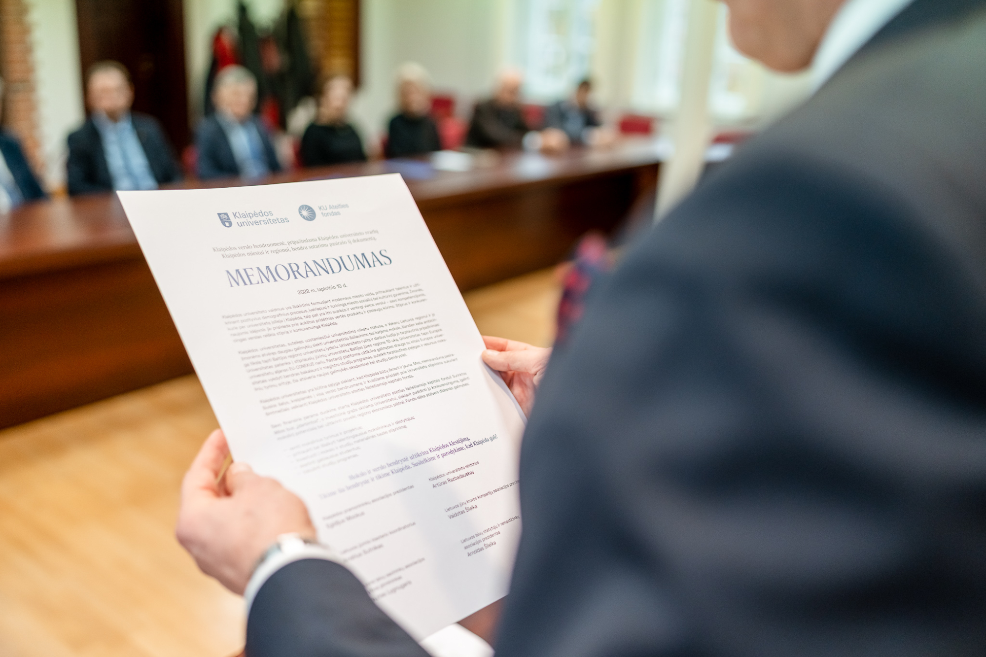 The memorandum emphasised the importance of Klaipėda University's role for shaping the image of a contemporary city, attracting talents and ensuring positive demographic processes as well as diverse and rich social and cultural life of the city. "The people who come to Klaipėda through the University are also extremely important and valuable for local businesses: through their competences and new ideas, they contribute to the development of products and services with high added value. A strong and competitive business means a strong and competitive Klaipėda", the document states. The business community is invited to contribute to the strengthening of the University by building up the KU endowment capital fund for the future. In order for such a fund to start functioning, it is necessary to accumulate capital of 0.5 million Euros, the investment return of which would allow KU to finance research and projects, attract and retain the most talented researchers and academics, invest in upgrading the infrastructure for research and studies, encourage the most talented students, and improve study programmes.