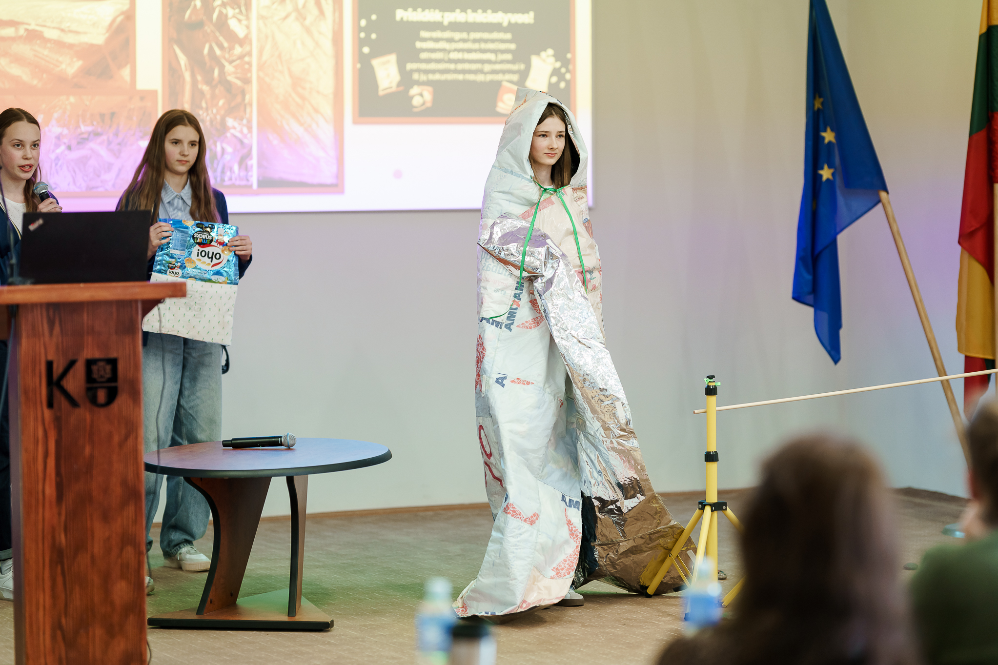 In the younger age category, the winner was the Environmental Sustainability team from Klaipėda Simon Dach Progymnasium. The pupils made a thermal sleeping bag/cloak/blanket from recycled materials. “Our goal was not only to create a product that would help people in case of a disaster, but also to contribute to the fight against the effects of climate change,” says the team members when presenting the project.