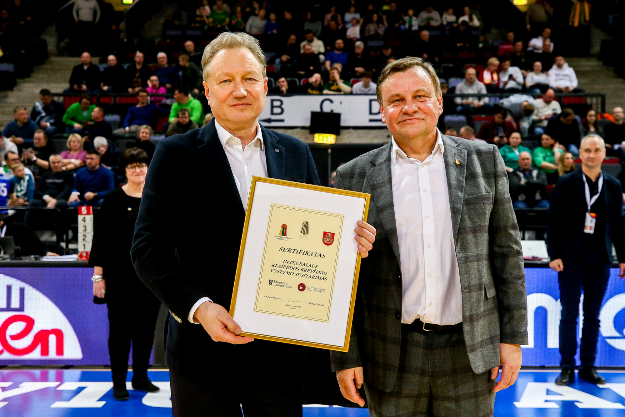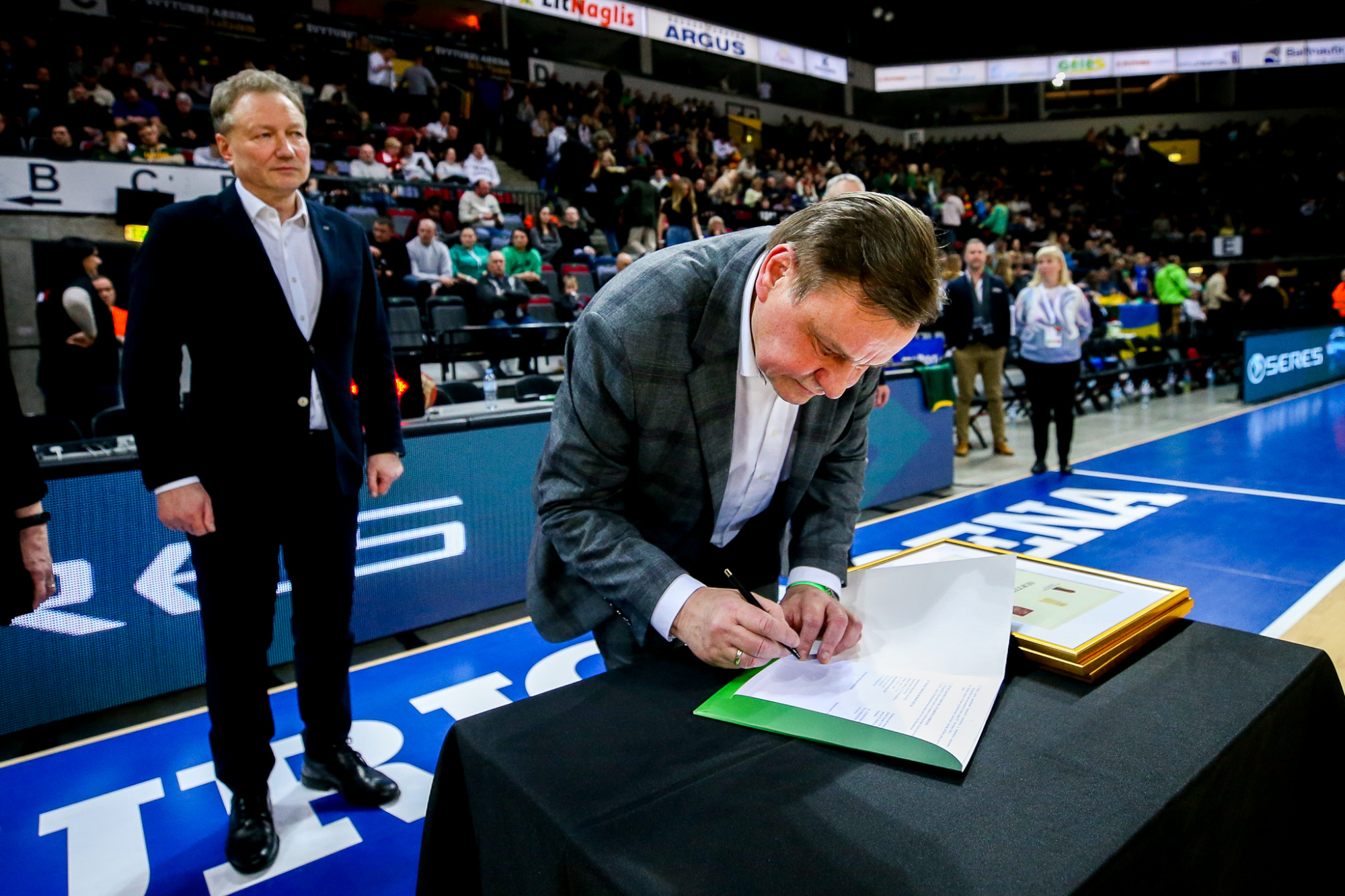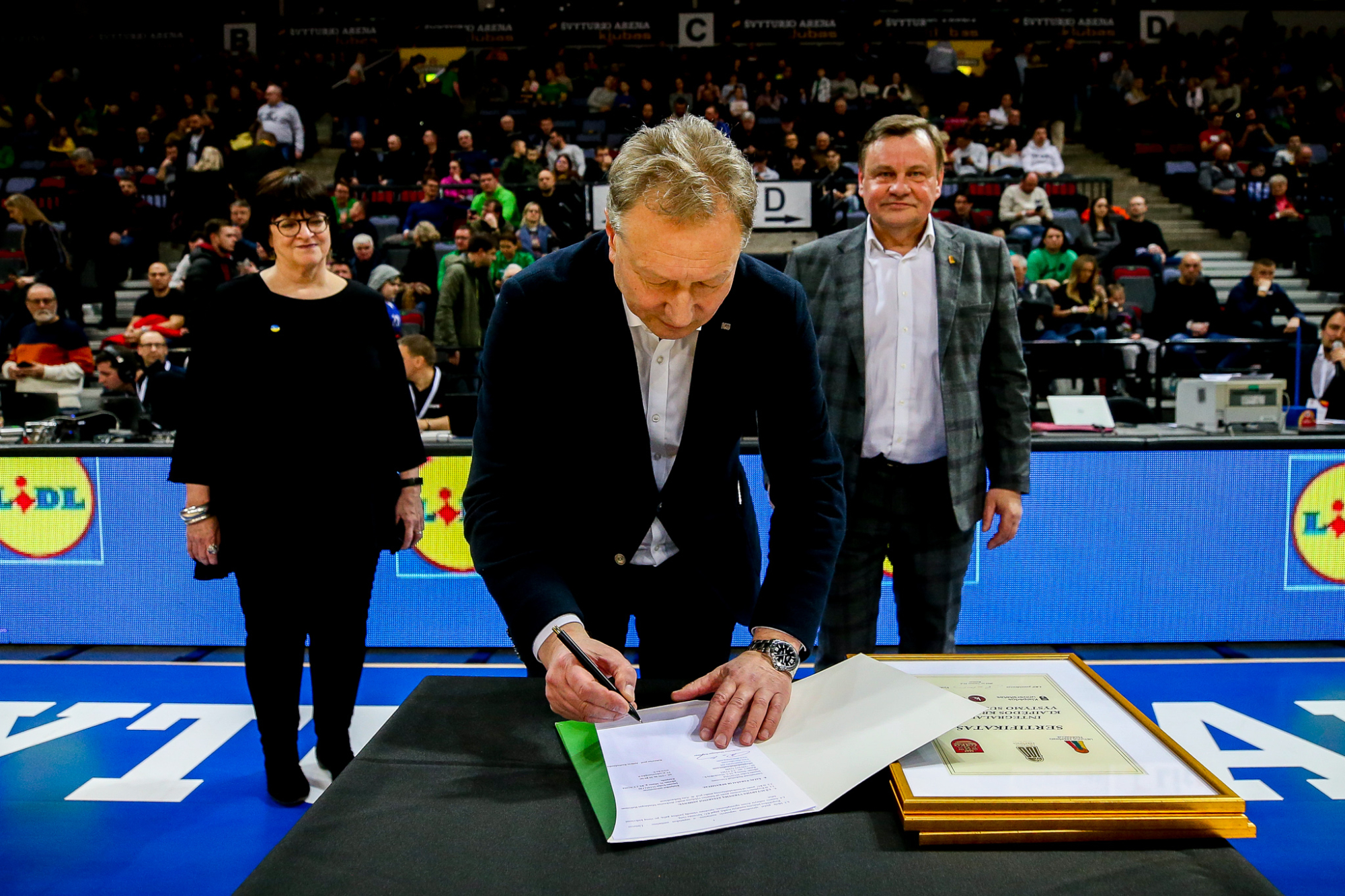 The agreement was signed by the LBF President Vydas Gedvilas and Klaipėda University Rector prof. Artūras Razbadauskas in front of an audience of thousands of basketball fans.