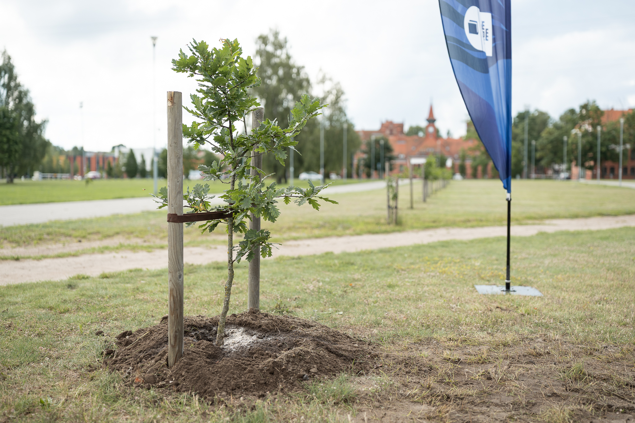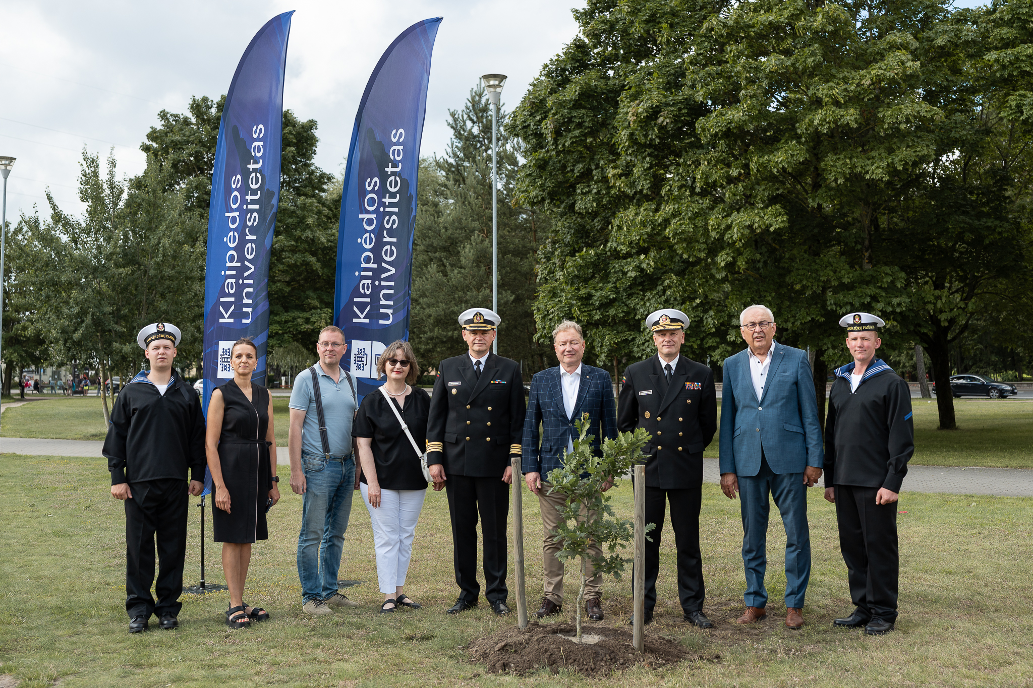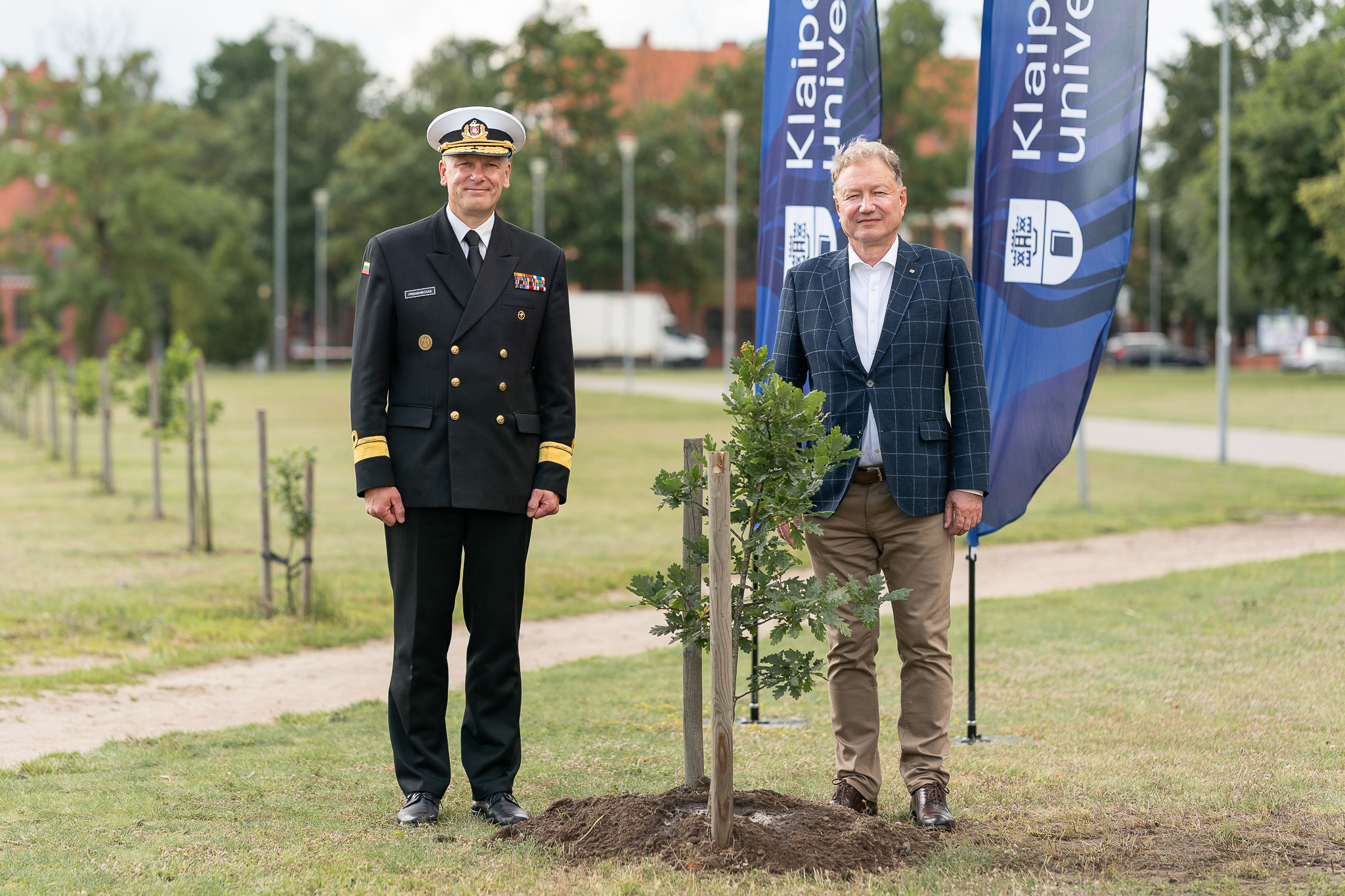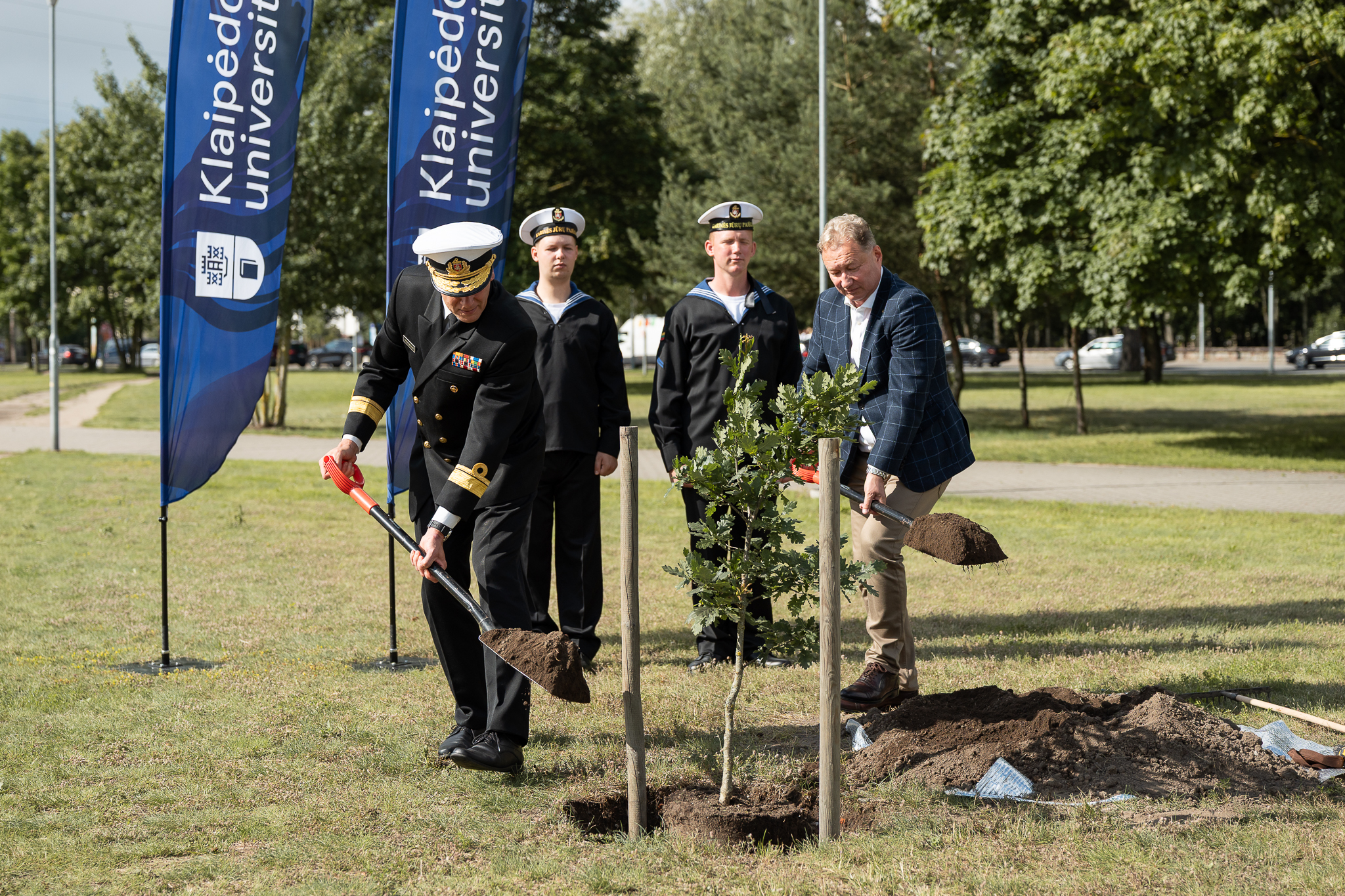 The oak was planted to honor the 90th anniversary of the Lithuanian Naval Force, which was established in 1935. Participating in the planting ceremony were Prof. Dr. Artūras Razbadauskas, Rector of Klaipeda University, and Flotilla Admiral Giedrius Premeneckas, Commander of the Lithuanian Naval Force and also a KU alumnus.