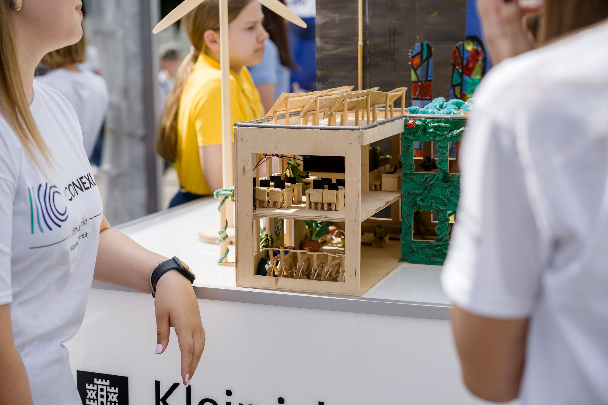 Another team of pupils from Klaipėda Simon Dach Progymnasium presented “Our Future Eco Show” project. The team created a model of the school of the future using recycled materials only. Based on the principles of sustainability and eco-friendliness, the school is designed to function as a closed ecosystem that sustains itself. The ground floor is accommodated with a waste management space, a worm farm for recycling garden waste, a water tank, and an educational space for papermaking. On the second floor there is a clothing swap space, and on the third floor – a lounge area with aquaponic fish tanks, as well as a bicycle parking station with charging cells. A vegetable garden is located next to the school.