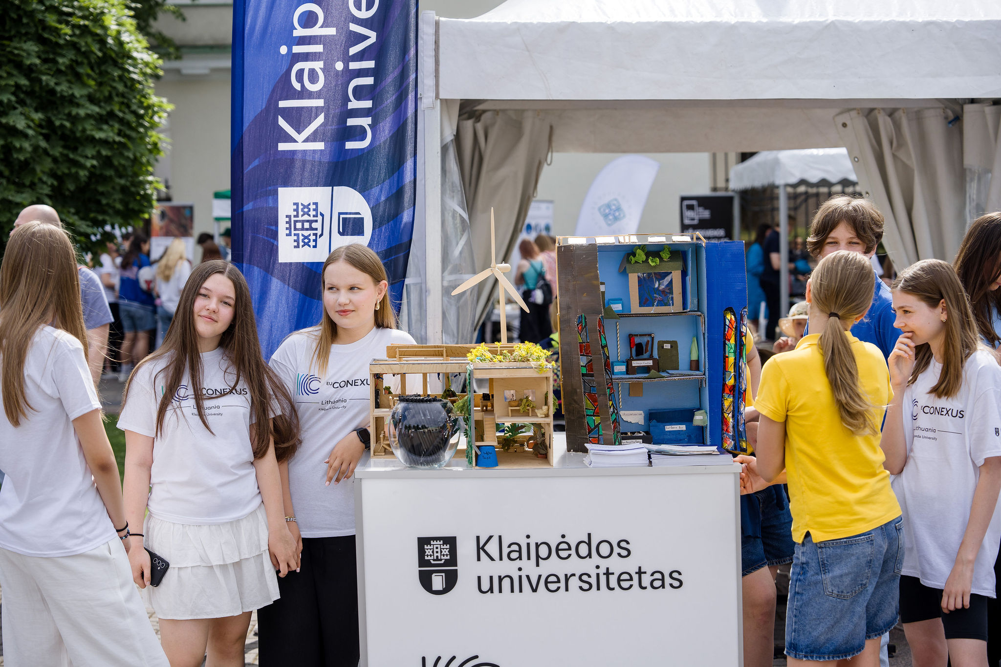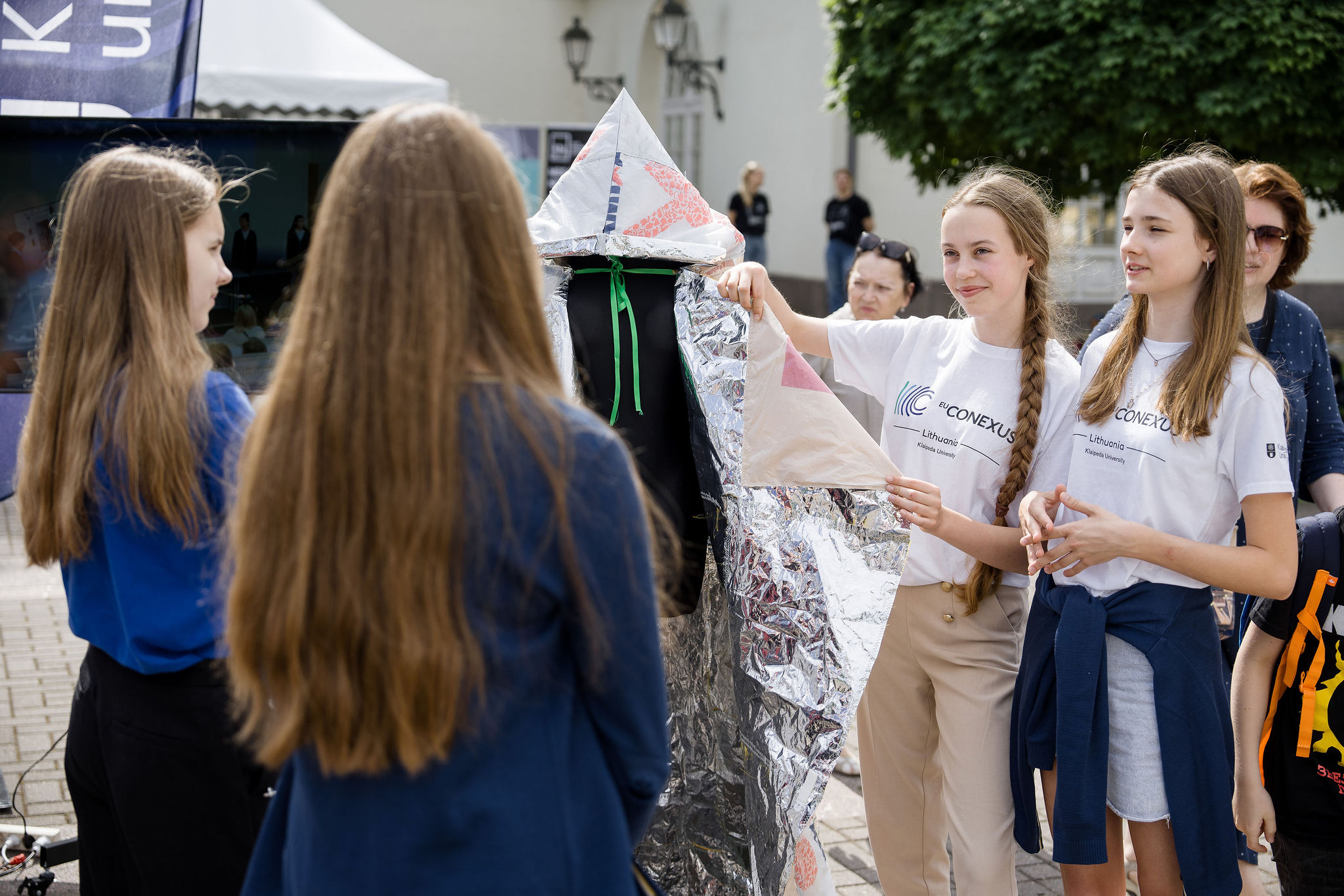 At the event to mark World Environment Day, “Tent-Cloak-Sleeping-Bag” project was presented to schoolchildren, teachers, and other visitors by the winners of this year’s EU-CONEXUS contest Think Smart, Create Green by the pupils of Klaipėda Simon Dach Progymnasium. The team created a tent-cloak-sleeping-bag for the contest. The pupils had announced a packaging collection campaign, cleaned and washed greasy packaging. It was used to make the first layer of the invented product; the next layer was made from non-degradable plastic bags and the middle was filled with used cotton fabrics. Such a cloak can be used as a tent to save people, for example, in the event of an earthquake, or as a coat to keep people warm and protect from rain, or as a sleeping bag.