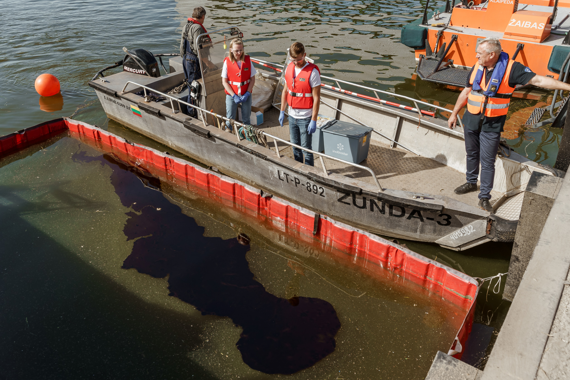 Scientific research civil safety exercise to neutralise oil pollutants was held in the water area of the Klaipėda State Seaport Authority (KSSA) fleet base on August 3. The purpose of the exercise was to test the effectiveness of the biotechnology developed by KU researchers under real conditions. The technology is unique due to a sorbent of natural origin – straw with oil-degrading microorganisms – being used to neutralise oil pollution. It is environmentally friendly, developed on the basis of inexpensive, natural materials and microorganisms extracted from the environment of the Baltic Sea, its water and sand, that are able to feed on oil products. The research team has been working on this project for more than one and a half years. They performed a number of complex lab analyses both in Lithuania and abroad. The technology has already been patented in Lithuania, and a priority application has been submitted to the European Patent Office.