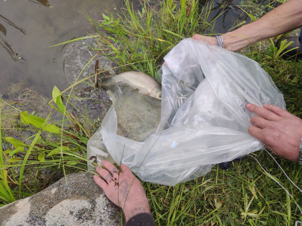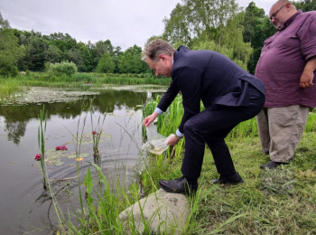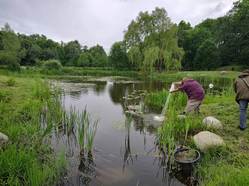 Asta Klimienė, Coordinator of the KU Botanical Garden, brought several grown-up grass carps (ctenopharyngodon idella) to the Garden and released them into the old bed of the Dangė River. Sergejus Ivanovas, a farmer of Klaipėda District, today released another approximately 100 one- and three-year-old grass carp younglings into the ponds. He said he did it in gratitude to Klaipėda University that once sent him to study in Denmark. Studies at the University of Copenhagen at the time helped him to set up a business, including the breeding of grass carps.