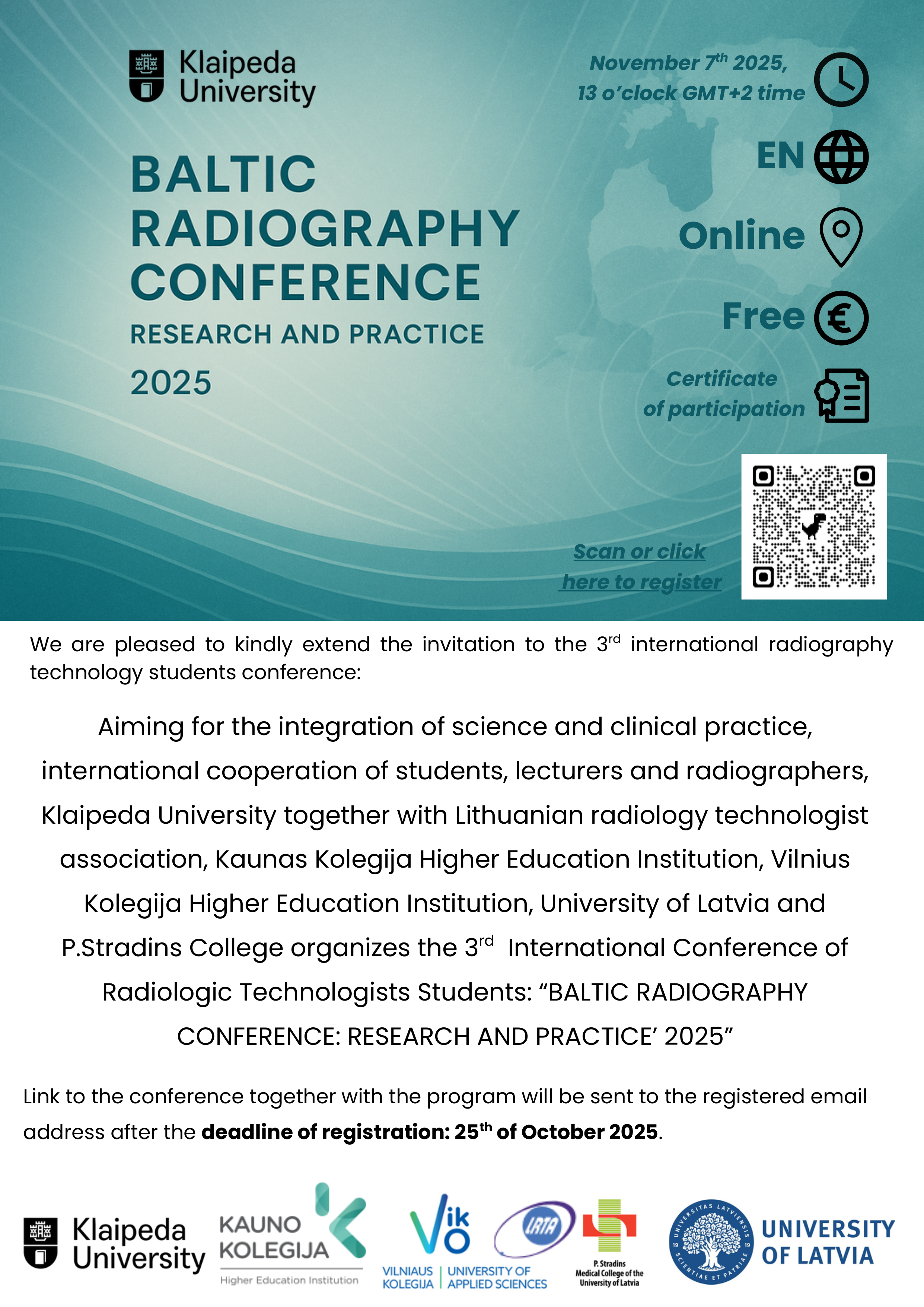 Kviečiame dalyvauti 3-oje Tarptautinėje Radiologijos technologų studentų konferencijoje: Konferenciją organizuoja Klaipėdos universitetas kartu su Lietuvos radiologijos technologų asociacija, Kauno kolegija, Vilniaus kolegija, Tartu kolegija, Latvijos universitetu ir P. Stradins kolegija. Konferencija vyks 2025 m. lapkričio 7 d. 13 val. nuotoliniu būdu. Renginio nuoroda ir programa Jums bus išsiųsta nurodytu el. pašto adresu likus kelioms dienoms iki konferencijos, bei paskelbta konferencijos tinklalapyje. Programa We are pleased to kindly extend the invitation to the 3rd international radiography technology students conference: Conference will take place at November 7th 2025, 13 o’clock GMT+2 time. Conference is meant for Radiography study program students, graduates, radiographers and academics. Deadline for registration is by October 24th 2025. Conference language is English. The conference is free of charge. While registering please use your full Name and Surname. Participants will receive a 5 hour participant certificate. Link to the conference together with the program will be sent to the registered email address. |