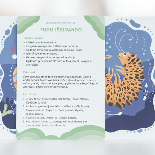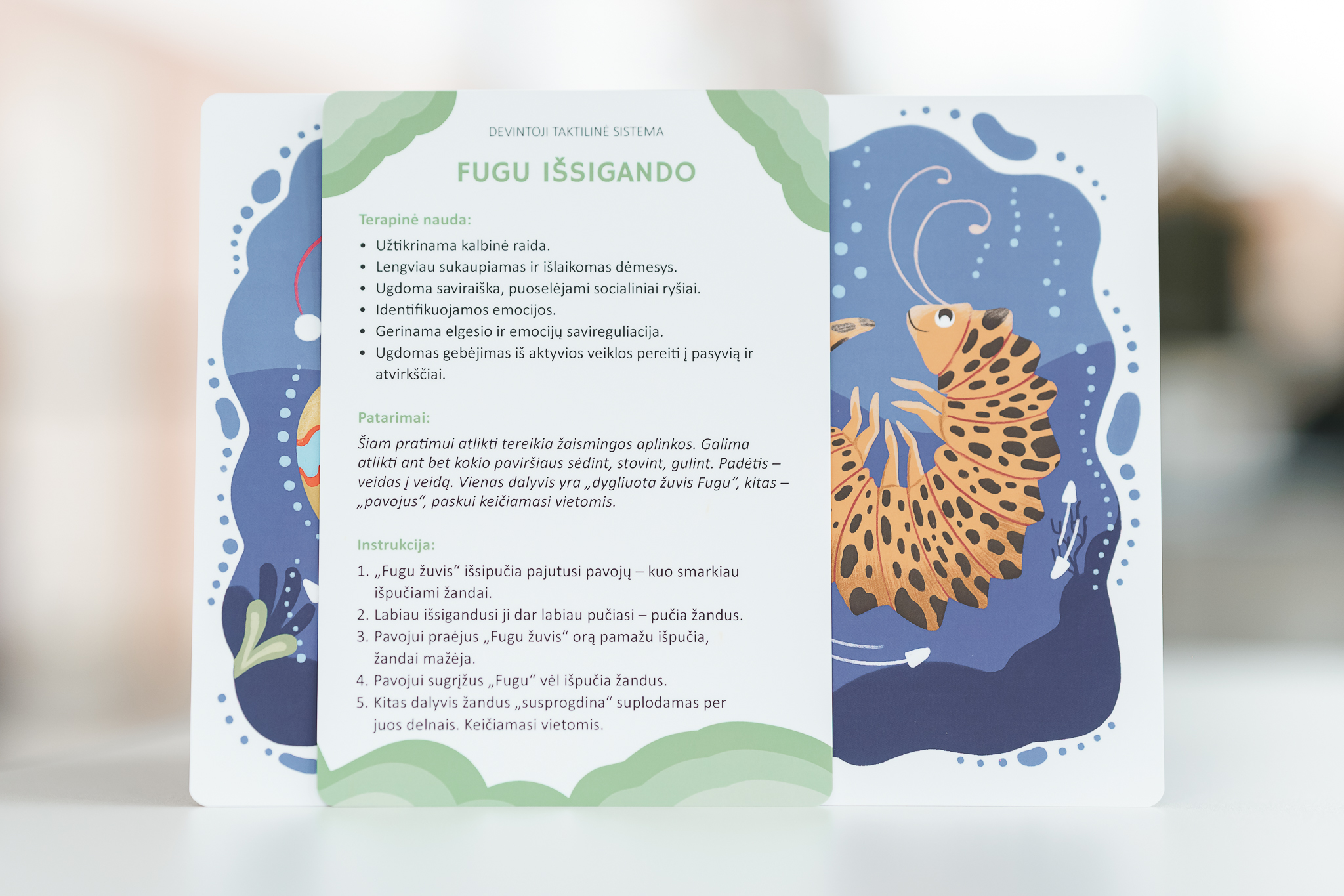 Anot prof. dr. B. Kreivinienės, vandens tematika kortelėse pasirinkta neatsitiktinai – ji artima vaikams, turintiems autizmo spektro sutrikimų, nes jūros motyvai jiems dažnai kelia saugumo jausmą.