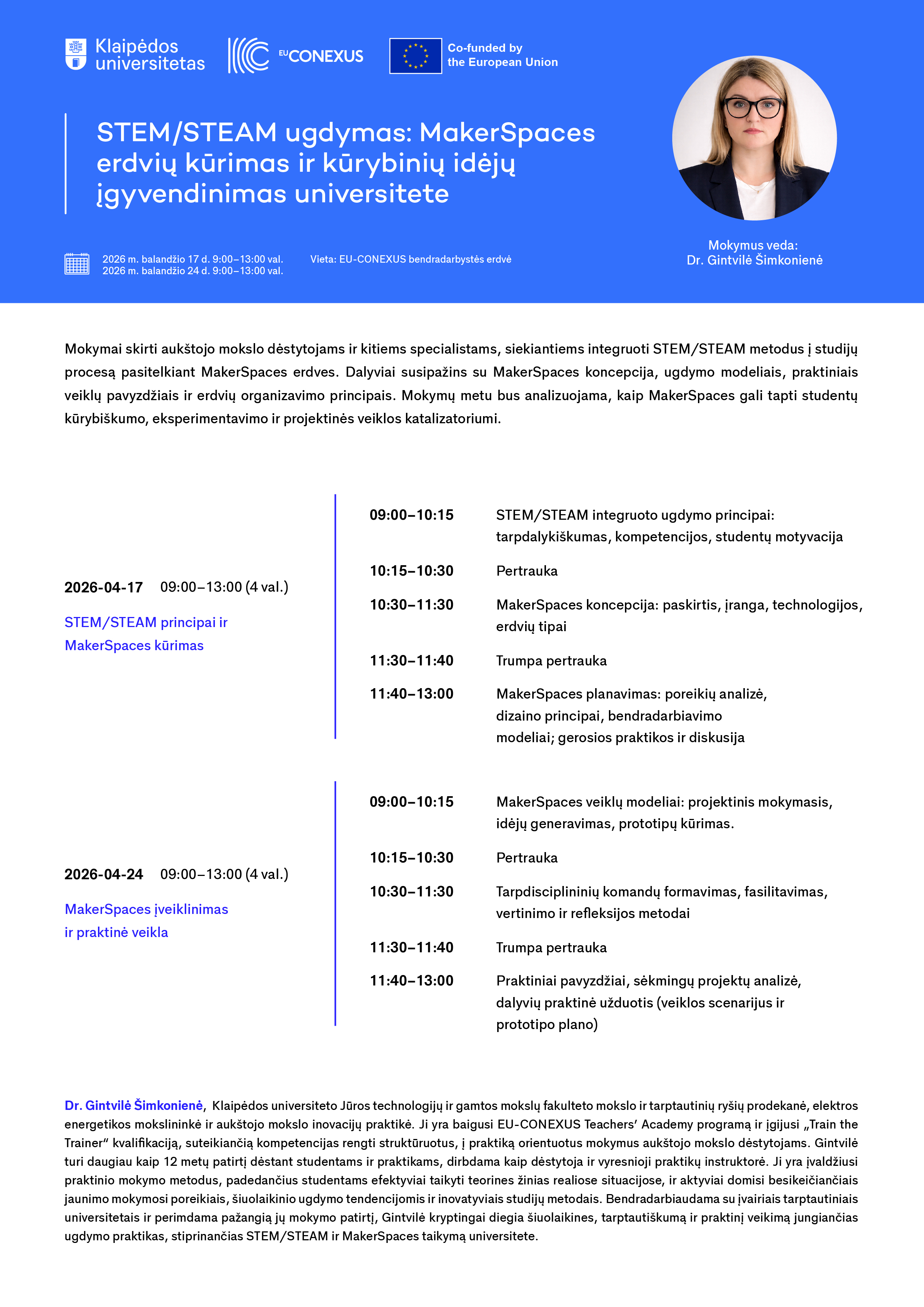 Mokymai skirti aukštojo mokslo dėstytojams ir kitiems specialistams, siekiantiems integruoti STEM/STEAM metodus į studijų procesą pasitelkiant MakerSpaces erdves. Dalyviai susipažins su MakerSpaces koncepcija, ugdymo modeliais, praktiniais veiklų pavyzdžiais ir erdvių organizavimo principais. Mokymų metu bus analizuojama, kaip MakerSpaces gali tapti studentų kūrybiškumo, eksperimentavimo ir projektinės veiklos katalizatoriumi.